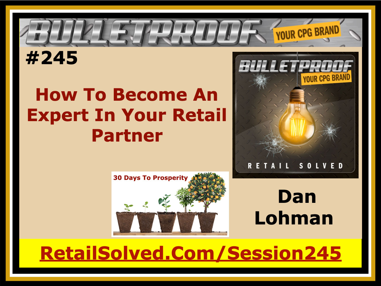 Important: Brand Secrets and Strategies has been rebranded to Retail Solved. Please swap all BrandSecretsandStrategies.com URL’s with RetailSolved.com. This is now the Bulletproof Your Brand podcast. Thank you for listening! No two retailers are the same. They deserve to be respected and valued. Their success is your success. Personalizing your relationship will pay huge dividends and give you the edge you deserve. Savvy retailers may reward you with incremental opportunities Welcome to Day 19: How To Become An Expert In Your Retail Partner The Retail solved Blueprint to teach you everything you need to know to confidently grow and scale your brand, build a connected community of loyal evangelists, and multiply your brands impact, sales, and profits. If we are meeting for the first time, my name is Dan Lohman. I’ve had the privilege of mentoring and working with hundreds of brands from pre-revenue to multi billion dollars in sales. This a culmination of the best strategies that are working today. I’ve spent years testing and perfecting them to save you valuable time and money while giving you the edge you deserve. If you haven’t done so yet, download the free 30 Days To Prosperity Workbook at RetailSolved.com/30DayWorkbook to help you get the most out of this brand-building series. Go back and listen to all of the episodes in this masterclass to that you don’t miss a thing. The strategies build upon each other in the order of the series. Please share these and help me raise the bar in natural. I want to take a moment to recap the last episode - How To Make And Sell Products Your Customers Want To Buy Topic: How To Become An Expert In Your Retail Partner For additional inspiration listen to podcast episodes: SECRETS 62 Todd Kluger With Lundberg Family Farms, Proven Strategies To Level The Playing Field & Win At Retail SECRETS 119 Tim Forrest With Tim Forrest Consulting, WHY MOST BRANDS FAIL - THE ROADMAP TO SALES SUCCESS SECRETS 123 Andrew Therrien With Big Orange Productions, Essential In-Store Marketing Strategies That Put Customers First & Grow Sales Tip of the day: No two retailers are the same. They deserve to be respected and valued. Their success is your success. Personalizing your relationship will pay huge dividends and give you the edge you deserve. I’ve recorded the video which has illustrations and additional information I can’t share on an audio podcast. You can watch the accompanying video on on the podcast webpage and you can get there by going to RetailSolved.com/Session245. In tomorrows show we’ll talk about Knowledge Is Power, How To Win At Retail. This episode will build on today’s conversation. Thanks for listening and I look forward to seeing you in the next show. Welcome to Day 19: How To Become An Expert In Your Retail Partner The Retail solved Blueprint to teach you everything you need to know to confidently grow and scale your brand, build a connected community of loyal evangelists, and multiply your brands impact, sales, and profits. If we are meeting for the first time, my name is Dan Lohman. I’ve had the privilege of mentoring and working with hundreds of brands from pre-revenue to multi billion dollars in sales. This a culmination of the best strategies that are working today. I’ve spent years testing and perfecting them to save you valuable time and money while giving you the edge you deserve. If you haven’t done so yet, download the free 30 Days To Prosperity Workbook at RetailSolved.com/30DayWorkbook to help you get the most out of this brand-building series. Go back and listen to all of the episodes in this masterclass to that you don’t miss a thing. The strategies build upon each other in the order of the series. Please share these and help me raise the bar in natural. I want to take a moment to recap the last episode - How To Make And Sell Products Your Customers Want To Buy Topic: How To Become An Expert In Your Retail Partner For additional inspiration listen to podcast episodes: SECRETS 62 Todd Kluger With Lundberg Family Farms, Proven Strategies To Level The Playing Field & Win At Retail SECRETS 119 Tim Forrest With Tim Forrest Consulting, WHY MOST BRANDS FAIL - THE ROADMAP TO SALES SUCCESS SECRETS 123 Andrew Therrien With Big Orange Productions, Essential In-Store Marketing Strategies That Put Customers First & Grow Sales Tip of the day: No two retailers are the same. They deserve to be respected and valued. Their success is your success. Personalizing your relationship will pay huge dividends and give you the edge you deserve. I’ve recorded the video which has illustrations and additional information I can’t share on an audio podcast. You can watch the accompanying video on on the podcast webpage and you can get there by going to RetailSolved.com/Session245. In tomorrows show we’ll talk about Knowledge Is Power, How To Win At Retail. This episode will build on today’s conversation. Thanks for listening and I look forward to seeing you in the next show.