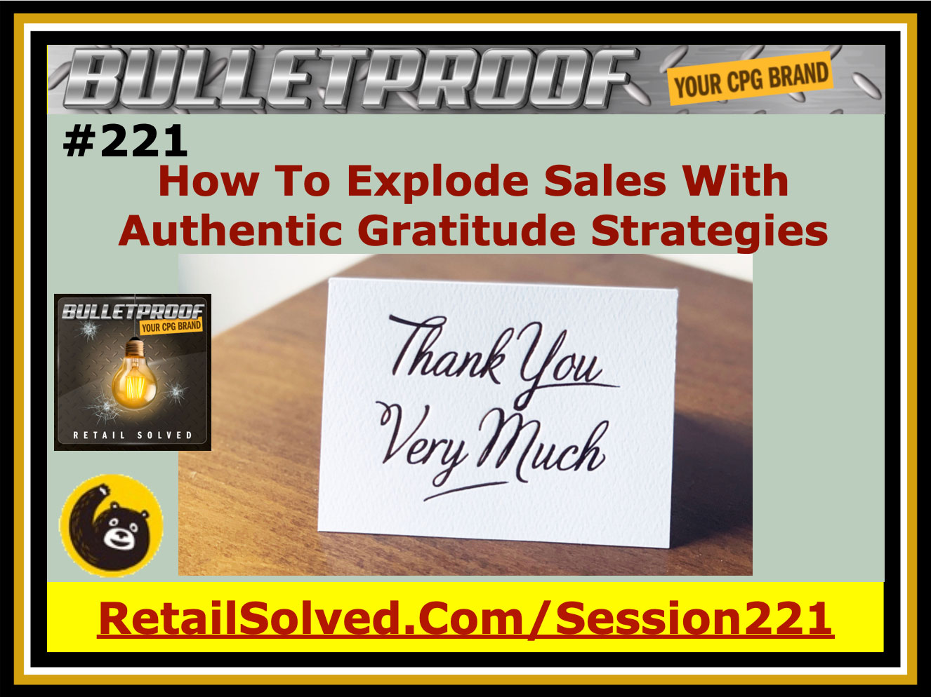 Important: Brand Secrets and Strategies has been rebranded to Retail Solved. Please swap all BrandSecretsandStrategies.com URL’s with RetailSolved.com. This is now the Bulletproof Your Brand podcast. Thank you for listening! There is a better way to boost shopper engagement and grow sales. It begins with building a connected community. Let your customers know that you appreciate and value them. Most brands spend more time trying to repeatedly re-acquire the same customer as opposed to nurturing their existing shoppers - why promotions are so expensive and ineffective. It’s a lot more effective to convert your existing customers into loyal evangelists. It’s also how you add rocket fuel to your growth while you future proof your brand. Everyone is overwhelmed by the pandemic. There is so much noise and confusion. We all want to return to our lives. This creates a unique opportunity for you to differentiate your brand from others and stand out from the crowd. You now have the ability to let shoppers know how much you appreciate them. Let them know that you value their input about your brand. Invite them to belong to your connected community. Would you like to know a surefire way to explode sales while converting occasional customers into loyal evangelists? If you do, then you're in the right place. Let's start the show. Let's roll up our sleeves and get started. Welcome. Today I want to talk about how to grow sales with authentic gratitude. This simple strategy can give you a huge competitive edge against any competition, any channel, and any economy. Imagine customers lining up to buy your product, or better yet, choosing your product over the competitive product all the time. That's what we're shooting for. How do we convert occasional shoppers into loyal evangelists? This is the secret to do that. And while there are no guarantees in life, there's one surefire strategy that's going to help you achieve your goals and your objectives. Before we get into that, let's define the problem. Let's talk about what's going on today. There's so much chaos or so much noise that we're all feeling overwhelmed. And for good reason. There are a lot of things to be concerned about. A lot of unknowns. Nobody knows what's going to happen tomorrow or the day after. But what we do know is that we need each other. And the only way that your brand can survive is if customers buy it. Let's roll up our sleeves and get started. Welcome. Today I want to talk about how to grow sales with authentic gratitude. This simple strategy can give you a huge competitive edge against any competition, any channel, and any economy. Imagine customers lining up to buy your product, or better yet, choosing your product over the competitive product all the time. That's what we're shooting for. How do we convert occasional shoppers into loyal evangelists? This is the secret to do that. And while there are no guarantees in life, there's one surefire strategy that's going to help you achieve your goals and your objectives. Before we get into that, let's define the problem. Let's talk about what's going on today. There's so much chaos or so much noise that we're all feeling overwhelmed. And for good reason. There are a lot of things to be concerned about. A lot of unknowns. Nobody knows what's going to happen tomorrow or the day after. But what we do know is that we need each other. And the only way that your brand can survive is if customers buy it. And the only way that you can get customers to buy it is if you get it discovered. If you make it easy for them to find and buy your product wherever they shop. Now believe it or not, that's the easy part. The hard part is how do you get them to buy your product the second time and the third time and so on. How do you get them to buy your product and then recommend your product or share your product with someone else? That's the focus of this story. You've heard me talk a lot about how the big brands spend most of their time talking at us. It's almost as if they shout out the win, telling us how great they are and how wonderful they are and why we need to choose their product over anything else. They believe that if they discount their product, that we're going to buy it no matter what. Well, your customers are different than that. Your customers want quality that they know, like and trust. Your customers want the very best ingredients. They want to know that they're supporting a cause or a mission that aligns with them, that's important to them. You know the importance of a personal recommendation from a friend about a product or a restaurant or something else. Their recommendation gives you instant trust in the brand and they remove all the risk, so it's easy for you to make a decision to try that product or to try that store. Well, what if you could have that kind of relationship with your customers? Think about how future-proof your brand would be. Imagine them telling you exactly what they want you to make, and then when you make it, knowing that they're going to buy it. And better yet, knowing that they're going to be telling all their friends about the amazing new product that's coming out soon. This is how you future-proof your brand, by understanding exactly what your customers want and delivering exceptional value. It's exactly why you started your brand in the first place. If you break selling down into its most simple components, it's really just helping someone find a solution to whatever their problem is. But before you can do any of that, you've got to develop a relationship with the customer. You've got to get them to trust you, to believe you, to realize that you have their best interest at heart. So how do you do that? It's a lot easier than you think. And the best part is, there's a real opportunity for you to differentiate the way that you communicate with your customer more today than ever. If you haven't figured out yet, if you've been listening to the show for a