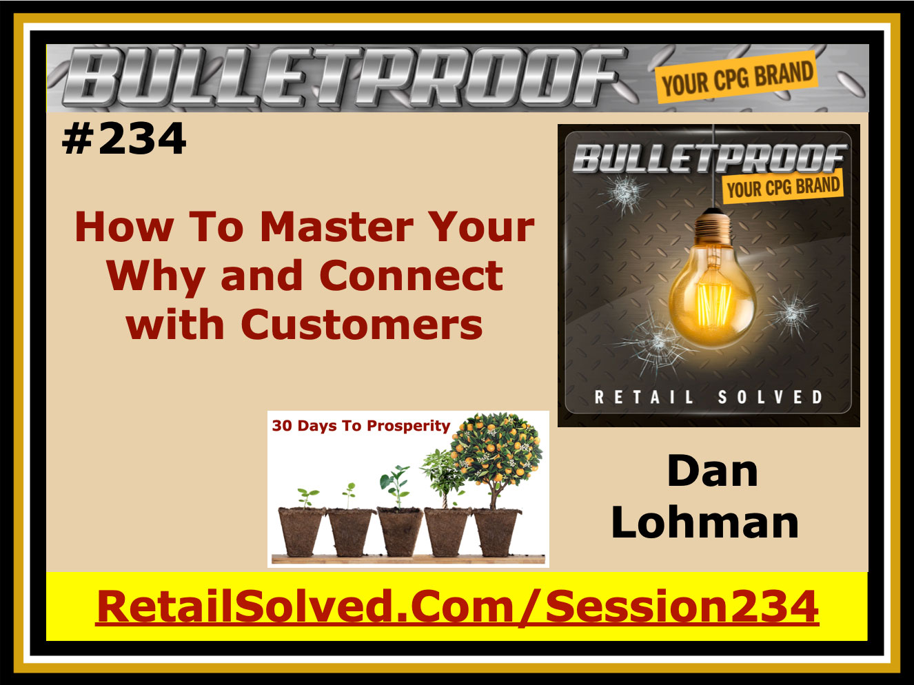 Important: Brand Secrets and Strategies has been rebranded to Retail Solved. Please swap all BrandSecretsandStrategies.com URL’s with RetailSolved.com. This is now the Bulletproof Your Brand podcast. Thank you for listening! Know your why! How does your mission (your why) align and resonate with your customers? Communicate in a single voice with the same passion, enthusiasm, and authenticity as the founder. Build a connected community, a loyal tribe of your ideal customers Welcome to day 8: How To Master Your Why - What Problem Do You Solve. The Retail solved Blueprint to teach you everything you need to know to confidently grow and scale your brand, build a connected community of loyal evangelists, and multiply your brands impact, sales, and profits. If we are meeting for the first time, my name is Dan Lohman. I’ve had the privilege of mentoring and working with hundreds of brands from pre-revenue to multi billion dollars in sales. This a culmination of the best strategies that are working today. I’ve spent years testing and perfecting them to save you valuable time and money while giving you the edge you deserve. If you haven’t done so yet, download the free 30 Days To Prosperity Workbook at RetailSolved.com/30DayWorkbook to help you get the most out of this brand-building series. Go back and listen to all of the episodes in this masterclass to that you don’t miss anything. The strategies build upon each other in the order of the series. Please share these and help me raise the bar in natural. I want to take a moment to recap the last episode How To Know The True Cost Of Your Products Turnkey course Big brands & solution providers commoditize customers Webinar How Are Shoppers Navigating The New Normal?https://RetailSolved.com/NewNormal For additional inspiration listen to podcast episodes: SECRETS 58 Kyle Garner With Organic India & Climate Collaborative, Start With A Mission In Mind - What Big Brands Can Learn From Disruptive Natural Brands SECRETS 161 How To Get Your Brand On More Store Shelves, Dan Lohman With Brand Secrets And Strategies SECRETS 50 Sheryl O’Loughlin With REBBL & Clif Bar, Killing It - Life lessons Of Humility, Love & Inspiration Most work to live. The inspired live to work with bold mission-driven visions that fuel their souls. A true leader is someone who humbly nurtures the creative spark within others to be more and do more. Mission and purpose are their guiding principles Tip of the day: I’ve recorded the video which has illustrations and additional information I can’t share on an audio podcast. You can watch the accompanying video on on the podcast webpage and you can get there by going to RetailSolved.com/Session234. In tomorrows show we’ll talk about How To Convert Your Dream Customers Into Loyal Evangelists. This episode will build on today’s conversation. Thanks for listening and I look forward to seeing you in the next show.