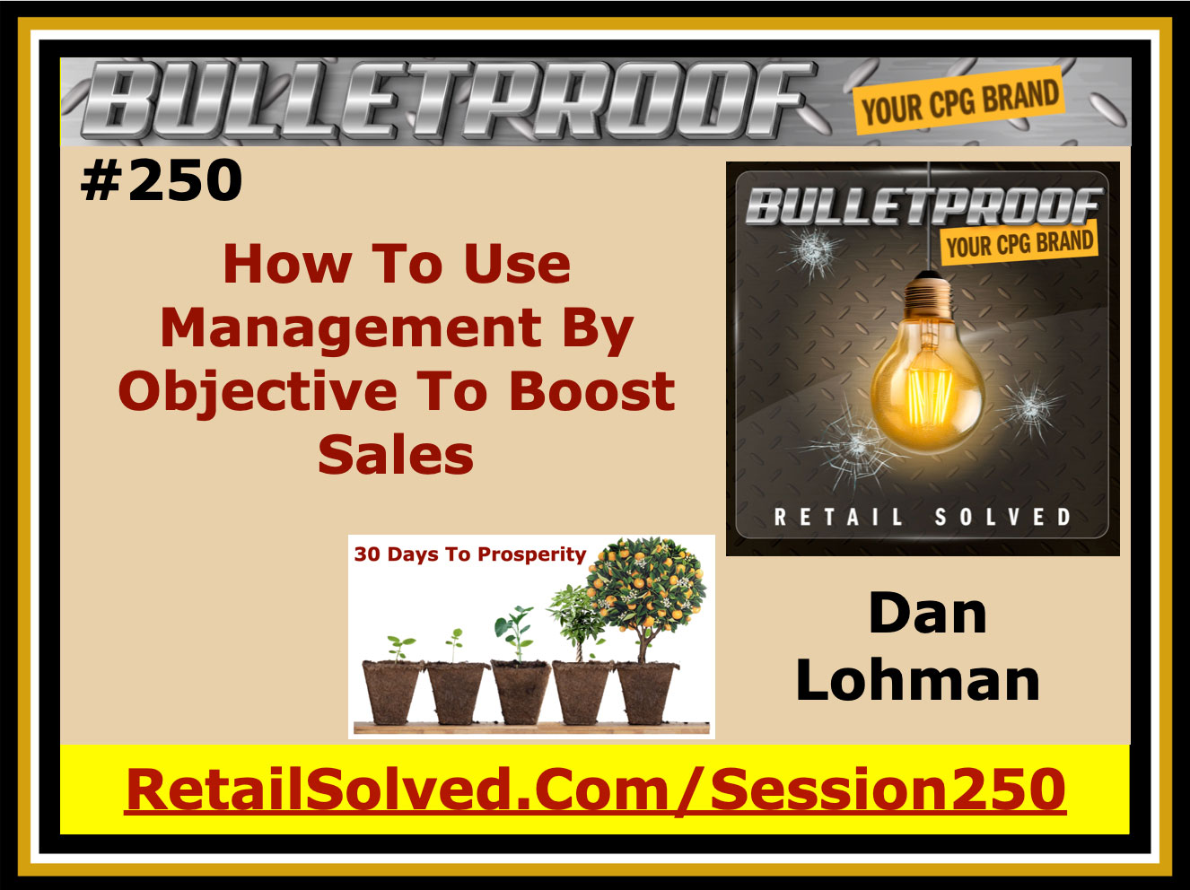 Important: Brand Secrets and Strategies has been rebranded to Retail Solved. Please swap all BrandSecretsandStrategies.com URL’s with RetailSolved.com. This is now the Bulletproof Your Brand podcast. Thank you for listening! MBO’s (Management By Objective) break strategic business objectives into bitesize chunks making them easier to digest & more attainable. Individual MBO’s rollup to organizational objectives driving the business forward creating high-performance teams Welcome to Day 24: How To Use Management By Objective To Maximize Sales (MBO’s) The Retail solved Blueprint to teach you everything you need to know to confidently grow and scale your brand, build a connected community of loyal evangelists, and multiply your brands impact, sales, and profits. If we are meeting for the first time, my name is Dan Lohman. I’ve had the privilege of mentoring and working with hundreds of brands from pre-revenue to multi billion dollars in sales. This a culmination of the best strategies that are working today. I’ve spent years testing and perfecting them to save you valuable time and money while giving you the edge you deserve. If you haven’t done so yet, download the free 30 Days To Prosperity Workbook at RetailSolved.com/30DayWorkbook to help you get the most out of this brand-building series. Go back and listen to all of the episodes in this masterclass to that you don’t miss a thing. The strategies build upon each other in the order of the series. Please share these and help me raise the bar in natural. I want to take a moment to recap the last episode - Be Laser Focused, Say "No" to Distractions Topic: How To Use Management By Objective To Maximize Sales Management By Objectives are commonly known as “MBO’s” Now we want to shift the focus from you to your team - the people you surround yourself with. The people you put in place to handle the day-to-day operations as well help you move the business forward. More specifically, how do you develop, motivate, and maintain a highly efficient team. You use MBO’s. As a leader, you need everyone working toward the same goals and objectives for the organization to be effective and successful. The best way for the organization to reach and achieve its goals and objectives is for everyone in it to work in a coordinated way toward the accomplish of the objective. Think of any team sport for example, the olympics. The team is only as successful as the weakest player. They all succeed and fail as a team. The same holds true for your business. Everyone has a specific well defined job that they need to be empowered and well trained to do. They also need to understand exactly what the objective and the goals are for their job and how they roll up to the unit and then to the total business. Let me give you an example. If you want to grow sales by 5% then you need to produce product more, right? That means you need to plan ahead of time to have more raw ingredients, packaging, production capability, warehouse space, and inventory on hand well before you start to promote that product. If you don’t, you will have out of stocks and your plan will fail miserable. You also need to coordinate your sales and marketing strategies. As soon as you know the product will be available and when you can begin to sell in additional displays, gain distribution at new retailers, and sell in the new items. You also need to have the trade promotion funds in place to support the your efforts. This is in addition to the additional capital required to fund and produce the additional product. The point here is that there are a lot of things to consider and think about and they all require planning and coordination. MBO’s are a great tool to help get everyone onboard on marching in lockstep toward a common goal or objective. MBO’s were created by management guru Peter Drucker in the 50’s and they are used across a variety of organizations because they work and because they lead to successful outcomes. They also help improve employee performance and they deliver predictable results. Risk reduction is critical to the success of your business. It also helps to improve your evaluations as well as making your brand more attractive to investors and retailers. A key strength of the MBO process is the collaboration between the workers and their team leads. In the next session we will be talking about scorecards which have a lot of similarities to MBO’s but are used as more of a project management tool. Use these tools in together to give your brand the edge it deserves. So, How do you set MBO’s up? What does an MBO look like Companies that use MBO’s typically have greater sales, are more drivenwith higher achievers, and they are more productive. Use them to help give your brand the competitive edge it deserves. For additional inspiration listen to podcast episodes: Tip of the day: MBO’s break strategic business objectives into bitesize chunks making them easier to digest and more attainable. Individual MBO’s rollup to accomplish larger organizational objectives driving the business forward. I’ve recorded the video which has illustrations and additional information I can’t share on an audio podcast. You can watch the accompanying video on on the podcast webpage and you can get there by going to RetailSolved.com/Session250. In tomorrows show we’ll talk about How To Ensure Flawless Execution Using Scorecards. This episode will build on today’s conversation. Thanks for listening and I look forward to seeing you in the next show.